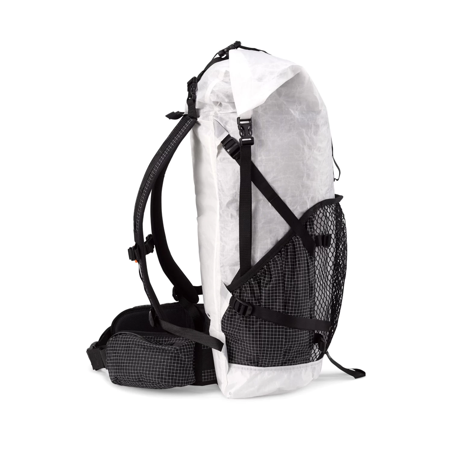 The 2400 Junction backpack from Hyperlite Mountain Gear is a premier pack designed to be ideal for ultralight weekend backpacking trips or section hikes where frequent resupply points are available. This pack is best suited for on-trail and light off-trail adventures. The main bag fabric is an ultra lightweight Dyneema® composite that is virtually waterproof in most conditions with it’s roll-top closure style design and seam-taped seams. The bottom section of the pack uses a more durable lightweight Dyneema® composite fabric. 5 external pockets provide quick access to all types of gear. The rear external mesh pocket is great for drying out wet clothing or gear as you go.