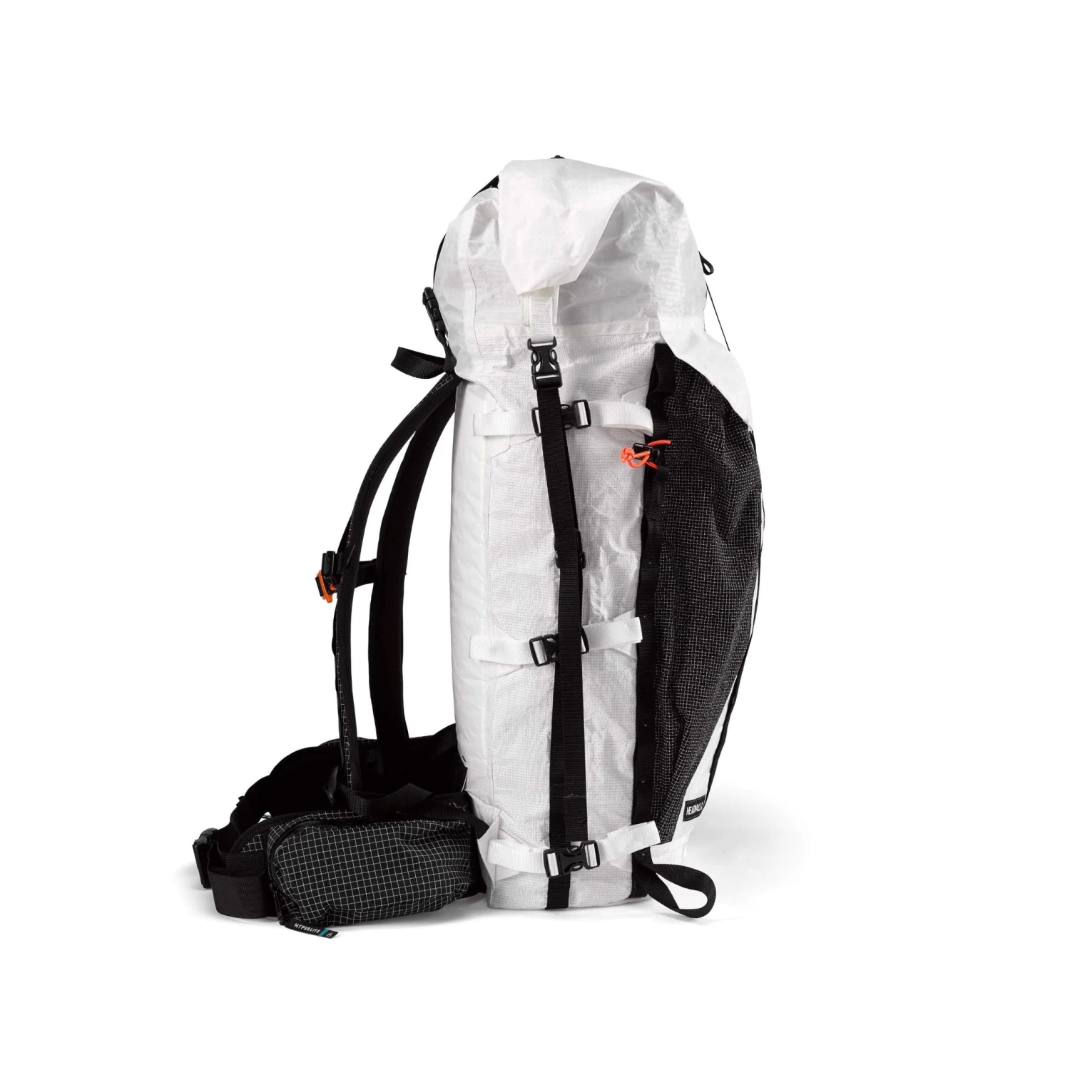 The Headwall 55 backpack from Hyperlite Mountain Gear is a premier ultralight backcountry ski and splitboard snowboard mountaineering pack designed to be ideal for adventure trips of up to 5 days This pack can also be used for day touring when compressed down. The main bag fabric is a lightweight Dyneema® composite that is virtually waterproof in most conditions with it’s roll-top closure style design and seam-taped seams. The bottom section and high abrasion points of the pack use a more durable Fully Woven Dyneema® fabric. An external avalanche tools pocket allows for organization of and quick access to critical safety gear. Includes six dual-adjustable side compression straps for attaching skis or a split snowboard in A-frame carry style.